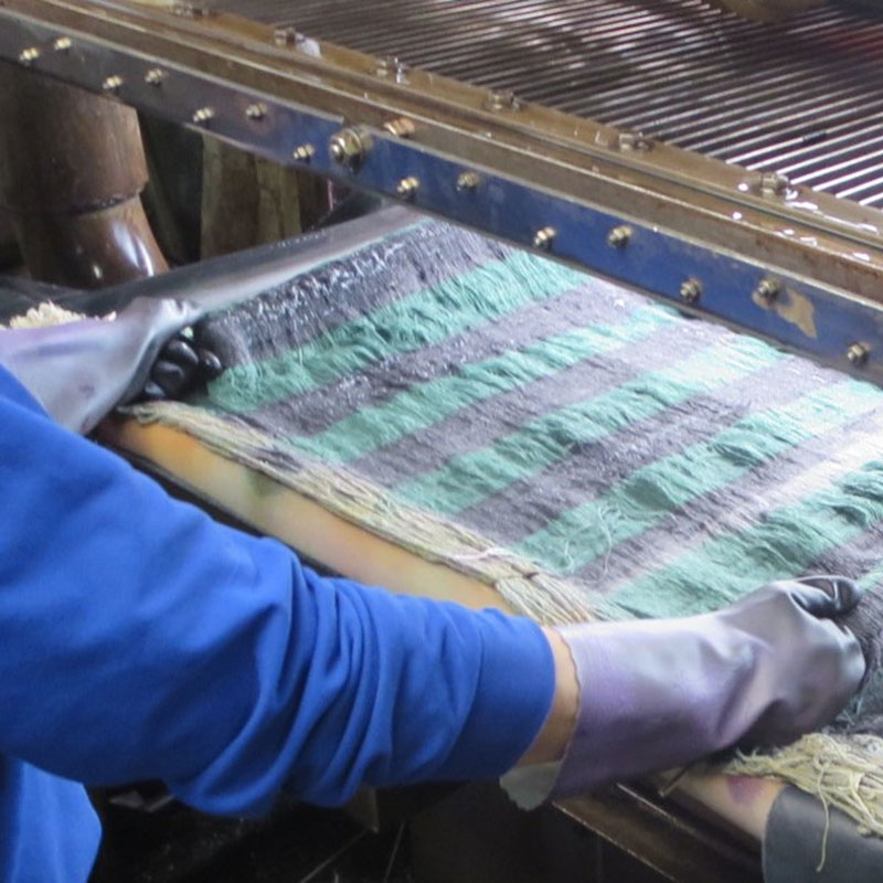 かすり糸との大きな違いは、大量生産 (1 ロット 400Kg 程度)が可能となることです。糸を染液の中に浸して染める方法(浸染、ずぶ染)と異なり、染料を糸で濾すようにして付着させ、部分的に異色に染めることができるのが特徴です。